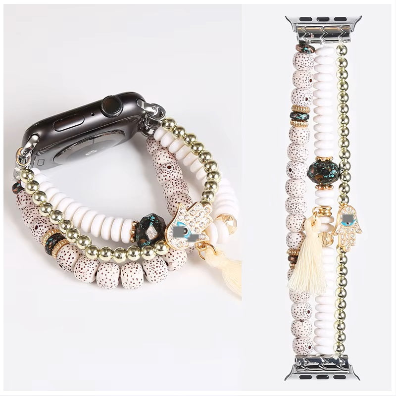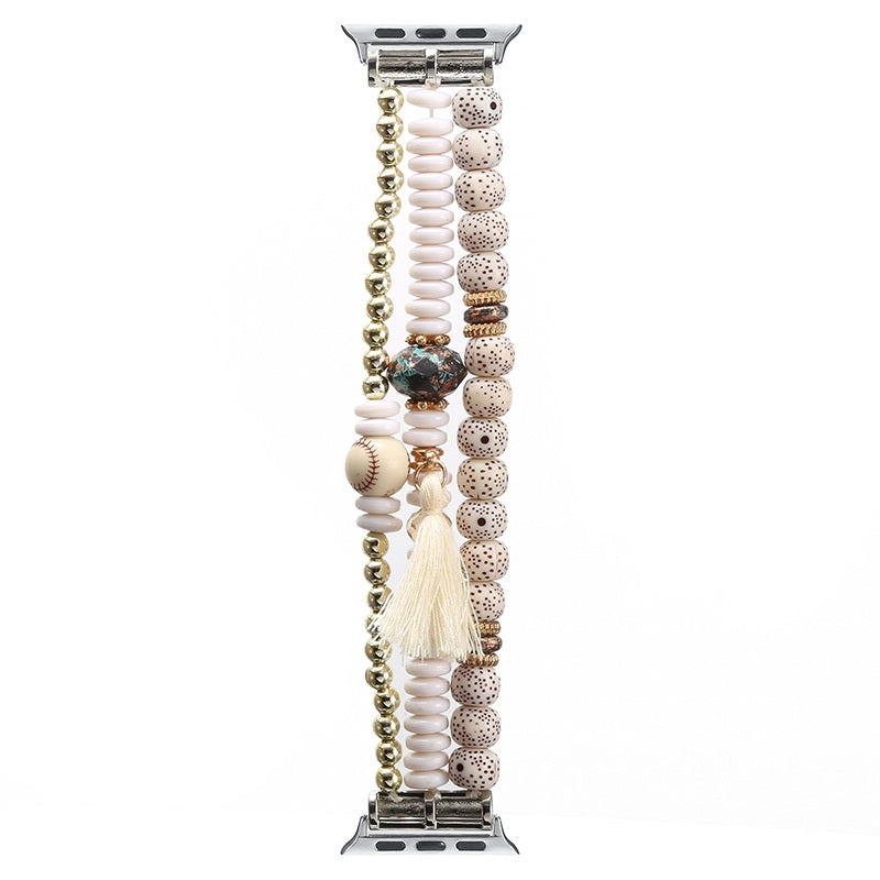 Eleva tu estilo con esta correa tipo pulsera bohemia para Apple Watch, una pieza diseñada para transformar tu reloj en un accesorio de moda único. Su estructura elástica compuesta por múltiples hileras de cuentas decorativas ofrece un look distintivo y artesanal, aportando un toque elegante, delicado y lleno de personalidad. Cada pieza combina elementos geométricos, detalles metálicos y adornos ornamentales para lograr una correa versátil, cómoda y visualmente llamativa.